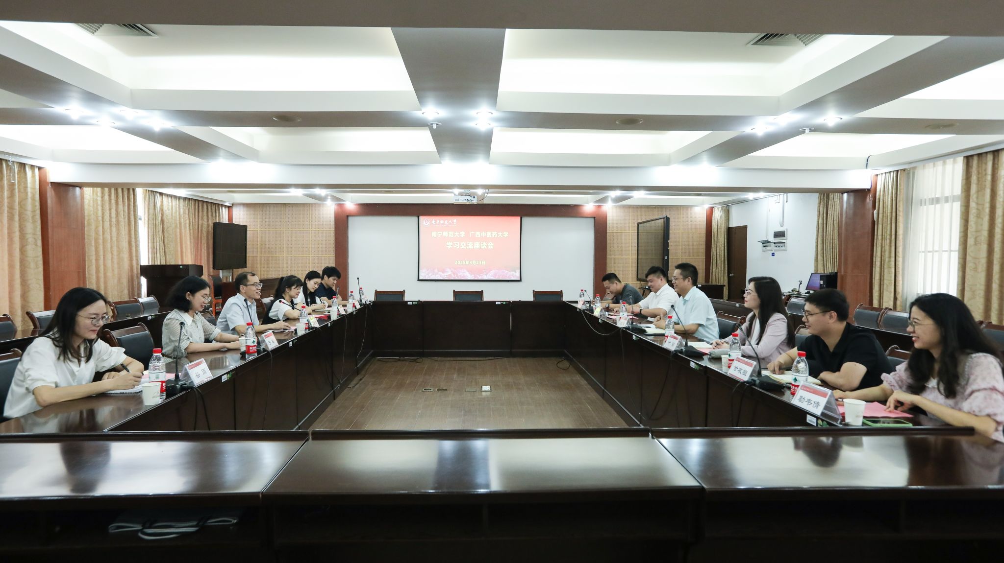 4月23日上午,广西中医药大学党委宣传部部长蓝开宝一行6人到beats365官网 网页版调研交流。学校党委宣传部部长纪明热情接待了蓝开宝一行,并举行交流座谈。