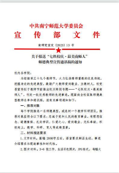 南师党宣发〔2023〕13号 beats365官网 网页版报送“七秩校庆·最美南师人”师德典型宣传通讯稿的通知